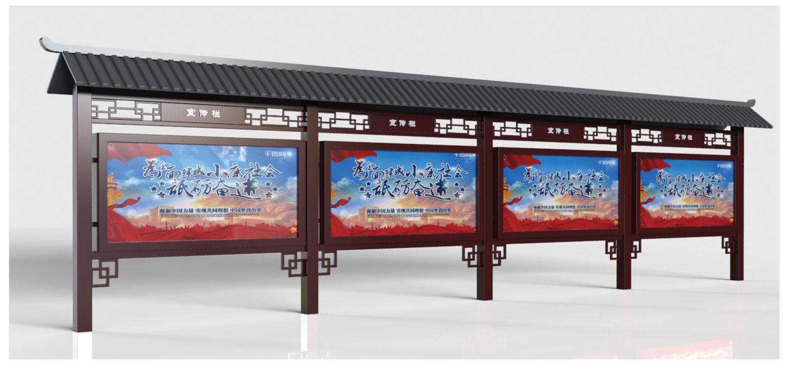 戶外仿古展示欄比較具有中國傳統文化風格。仿古的設計,能將更多元素融入其中,更好的將自然文化和古文化結合在一起,為了讓宣傳欄更具有代表性,在不同的場景要有不同的設計。