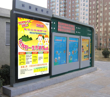 1.宣傳欄的設(shè)計和選材。宣傳欄的材質(zhì)多為鋼板、不銹鋼板、木材或鋁型材。鋼板和不銹鋼板的宣傳欄要采用鋼板烤漆的工藝,表面進(jìn)行防腐處理。為遮擋陽光和雨水,宣傳欄一般要有頂棚。宣傳欄有前開門和后開門之分,前開門一般用玻璃鎖,后開門用普通鎖具就可以。