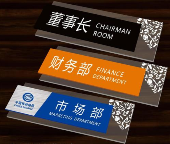辦公樓中的科室牌用于標(biāo)識房間的企業(yè)及部門名稱,也是企業(yè)VI形象的組成部分??剖遗埔话阌善髽I(yè)自行設(shè)計制作,個別大廈由物業(yè)單位統(tǒng)一進(jìn)行規(guī)劃制作??剖遗频陌l(fā)展經(jīng)歷了木牌、銅牌、不銹鋼牌等,型材科室牌是今后發(fā)展的主流方向。
