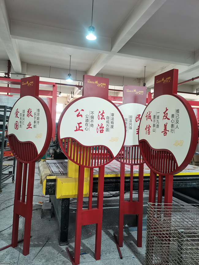 核心價(jià)值觀標(biāo)牌被運(yùn)用于各種場合,如市政單位、公園、企業(yè)、道路旁、街道等等。標(biāo)識(shí)標(biāo)牌的造型多樣且越來越獨(dú)特新穎,主色調(diào)基本都是紅色,外觀上有這鮮明的特點(diǎn),其內(nèi)容主要為:弘揚(yáng)社會(huì)主義價(jià)值觀和社會(huì)主義文化。核心價(jià)值觀標(biāo)識(shí)還包含宣傳欄,為了避免日曬雨淋,許多宣傳欄會(huì)加一個(gè)頂棚。